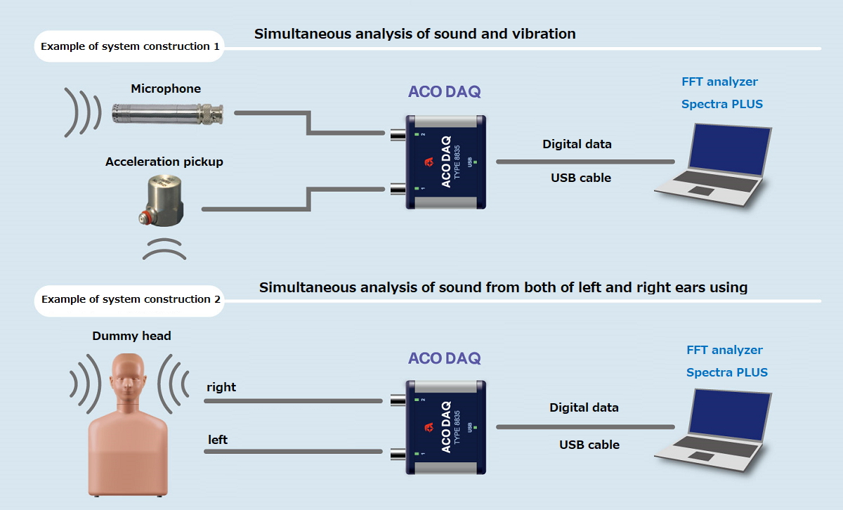 ACO DAQ is a compact and light weight 2 channel AD converter developed for the purpose of audio recording or analysis. When connected using USB interface, etc. it is recognized by Windows system as USB audio codec device, and general recorder / measurement application program can be used without requiring installation of exclusive device driver.