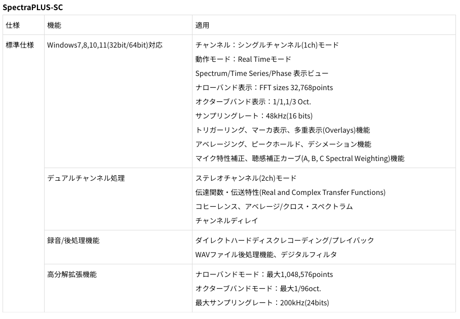 標準仕様 | Windows7,8,10,11(32bit/64bit)対応 | チャンネル:シングルチャンネル(1ch)モード 動作モード:Real Timeモード Spectrum/Time Series/Phase 表示ビュー ナローバンド表示:FFT sizes 32,768points オクターブバンド表示:1/1,1/3 Oct. サンプリングレート:48kHz(16 bits) トリガーリング、マーカ表示、多重表示(Overlays)機能 アベレージング、ピークホールド、デシメーション機能 マイク特性補正、聴感補正カーブ(A, B, C Spectral Weighting)機能 |