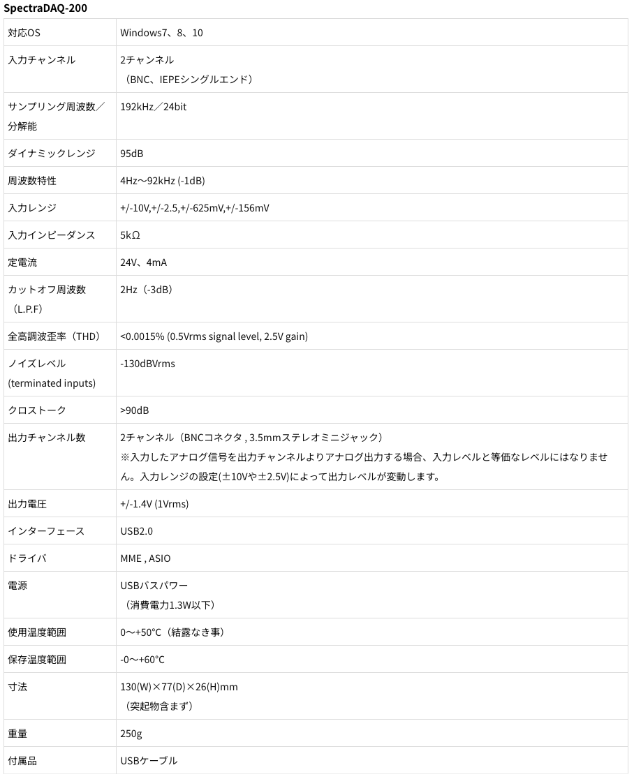 出力チャンネル数 | 2チャンネル(BNCコネクタ , 3.5mmステレオミニジャック) ※入力したアナログ信号を出力チャンネルよりアナログ出力する場合、入力レベルと等価なレベルにはなりません。入力レンジの設定(±10Vや±2.5V)によって出力レベルが変動します。 |