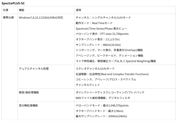 標準仕様 | Windows7,8,10,11(32bit/64bit)対応 | チャンネル:シングルチャンネル(1ch)モード 動作モード:Real Timeモード Spectrum/Time Series/Phase 表示ビュー ナローバンド表示:FFT sizes 32,768points オクターブバンド表示:1/1,1/3 Oct. サンプリングレート:48kHz(16 bits) トリガーリング、マーカ表示、多重表示(Overlays)機能 アベレージング、ピークホールド、デシメーション機能 マイク特性補正、聴感補正カーブ(A, B, C Spectral Weighting)機能 |