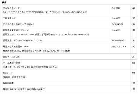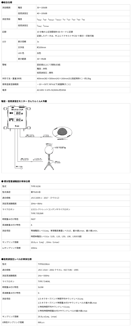 騒音・低周波音圧モニター 騒音計 TYPE 6236、低周波音圧レベル計 TYPE 6238LA(G カード内蔵)他 | きんりんくんA | 1式 |
