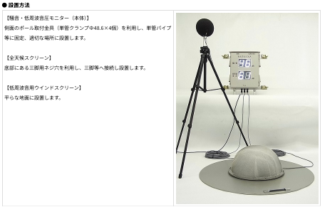 低周波音測定用の全天候ウインドスクリーンを地盤に設置し、低周波音の自動計測を行います。 測定範囲は、40dB~100dBです。 測定周波数範囲は、1Hz~500Hzです。(JIS C 1514:2002 クラス1、ISO7196:1995) 低周波音圧レベルの瞬時値をLED表示器に表示します。 |
