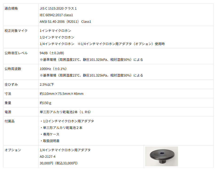 JIS C 1515:2020 クラス1、IEC60942:2017 Class1に適合し、安定したコンデンサマイクを制御センサとして使用しています。発生音圧レベルをリアルタイムで厳重に管理しているため、気圧変化やマイクロホンの挿入不良などによる誤差も発生しにくく、精度・安定性は小型ながら比類のないものとなっています。また、専用アダプタを付属し、精密騒音計の校正はもちろん、1インチ、1/2インチ、1/4インチマイクロホンにも対応します。電池切れはLED点滅と発音停止により警告されるため、誤った音圧レベルで校正する心配もありません。発生周波数・音圧レベルは公称1000Hz・94dBで、多くの新技術を搭載した音の現場には欠かせない校正器となっています。