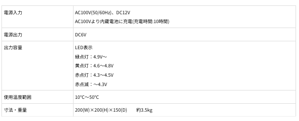 騒音計や振動レベル計等の長時間計測に便利です。普通騒音計 TYPE 6236の電源に使用した場合、内蔵バッテリーで約50時間使用できます。