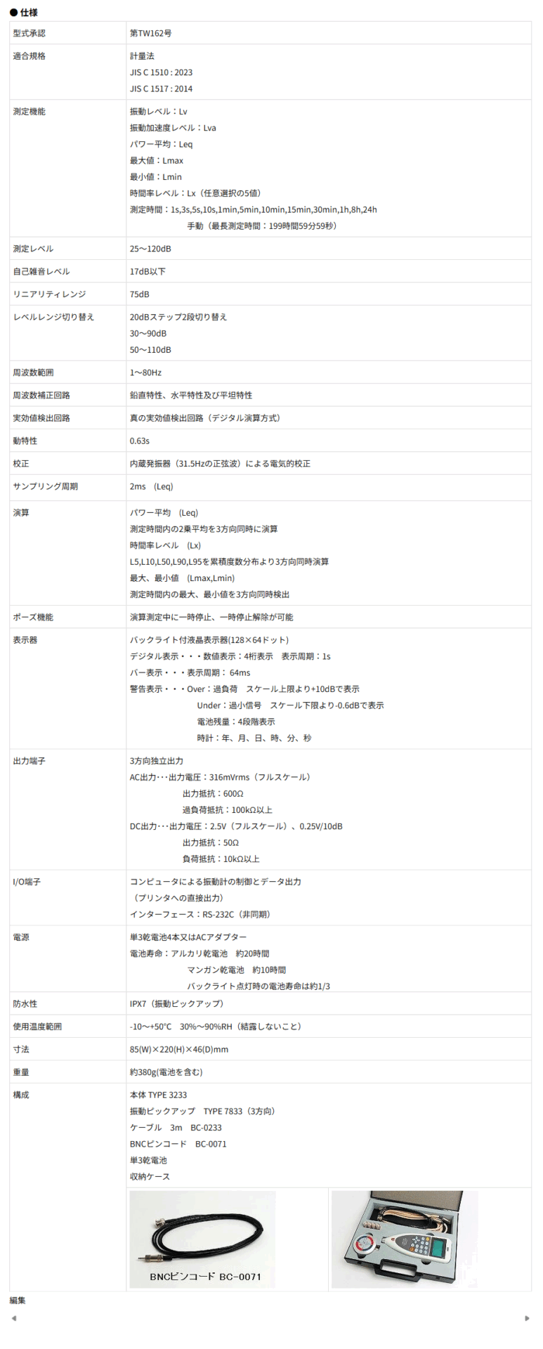 構成 | 本体 TYPE 3233 振動ピックアップ TYPE 7833(3方向) ケーブル 3m BC-0233 BNCピンコード BC-0071 単3乾電池 収納ケース |
