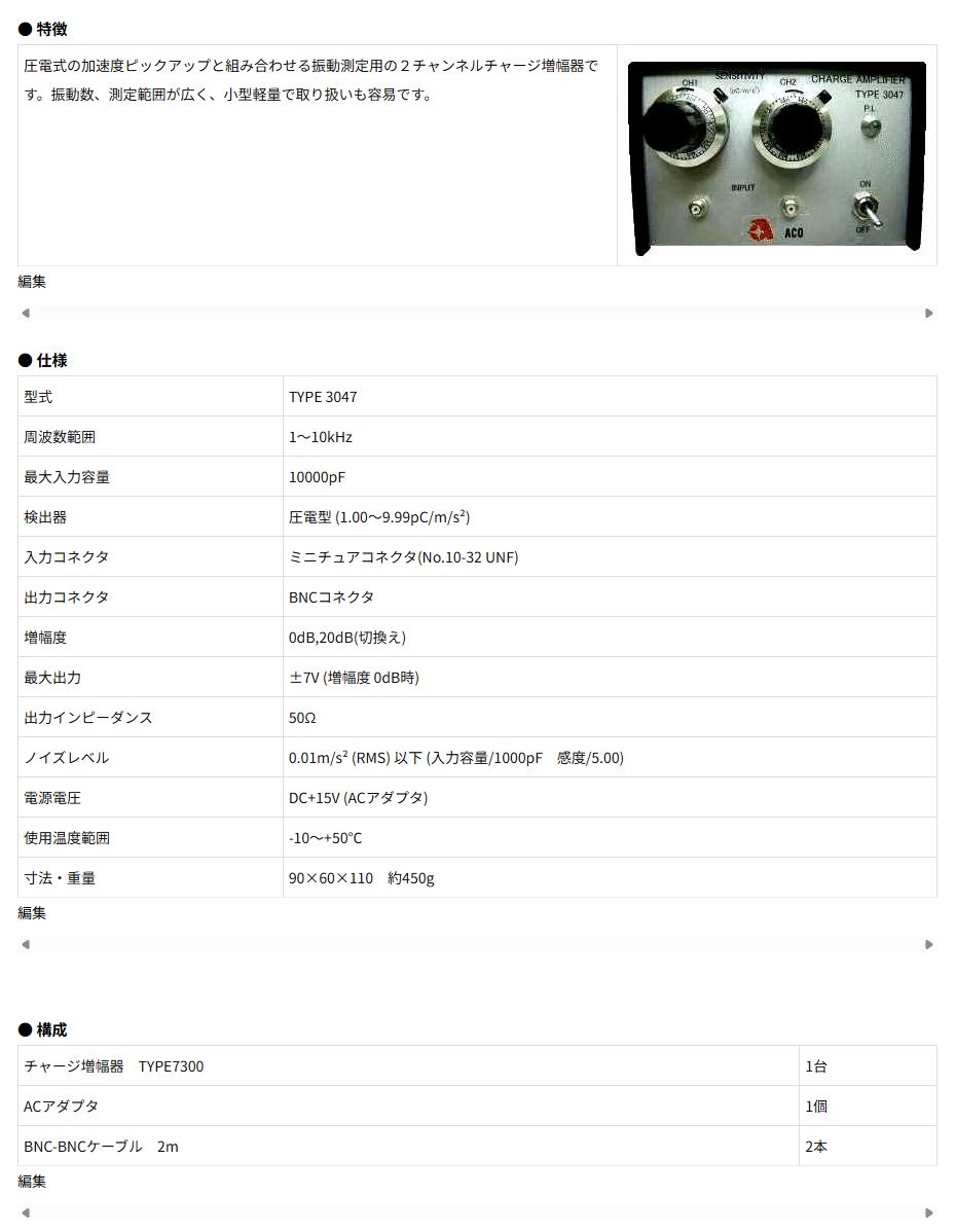 圧電式の加速度ピックアップと組み合わせる振動測定用の2チャンネルチャージ増幅器です。振動数、測定範囲が広く、小型軽量で取り扱いも容易です。 | ![]() |