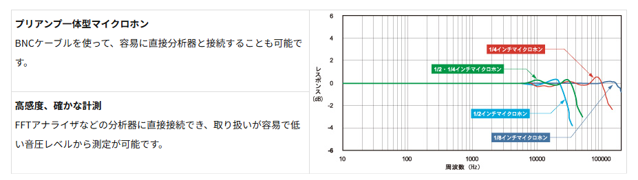 これらプリアンプ一体型マイクロホンの口径や電気音響的特性は、国際規格 IEC 61094-4:1995に適合しています。