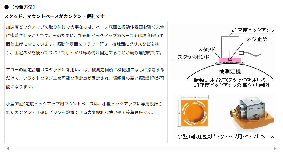 アコーの固定台座(スタッド)を用いれば、被測定個所に機械加工なしに接着するだけで、フラットなネジ止め可能な測定点が固定され、信頼性の高い振動計測が可能になります。