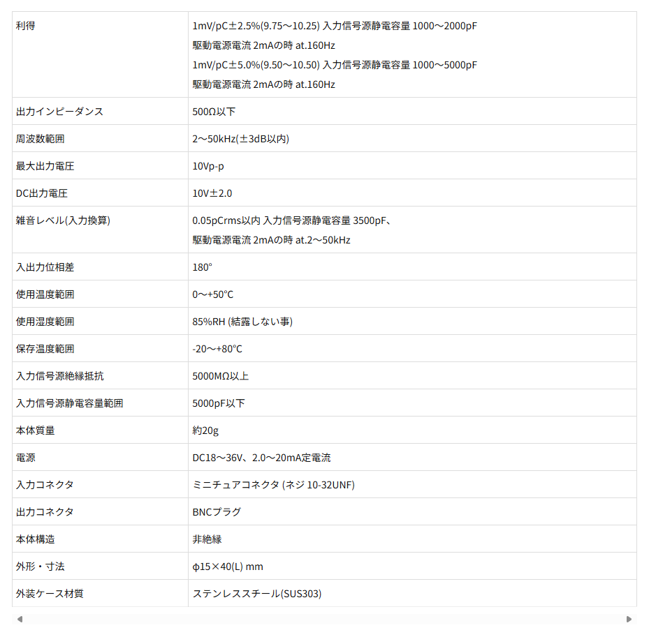 1mV/pC±5.0%(9.50~10.50) 入力信号源静電容量 1000~5000pF