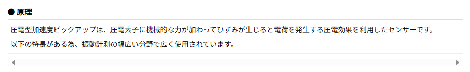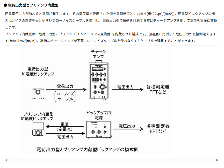圧電素子に力が加わると電荷が発生します。その電荷量で表示された値を電荷感度といいます(単位はpC/(m/s²))。圧電型ピックアップの出力はノイズの影響を受けやすい為ローノイズケーブルを使用し、電荷出力型で振動を計測する時はチャージアンプを用いて電荷を電圧に変換します。