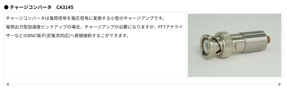 電荷出力型加速度ピックアップの場合、チャージアンプが必要になりますが、FFTアナライザーなどのBNC端子(定電流対応)へ直接接続するこができます。