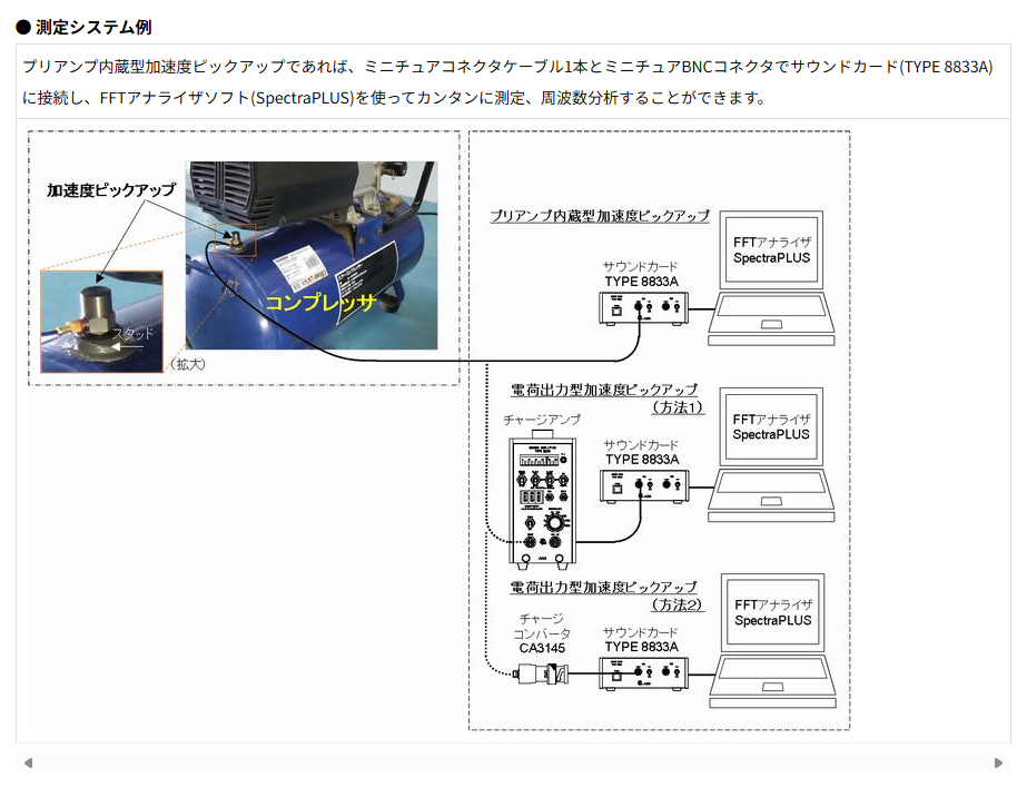プリアンプ内蔵型加速度ピックアップであれば、ミニチュアコネクタケーブル1本とミニチュアBNCコネクタでサウンドカード(TYPE 8833A)に接続し、FFTアナライザソフト(SpectraPLUS)を使ってカンタンに測定、周波数分析することができます。