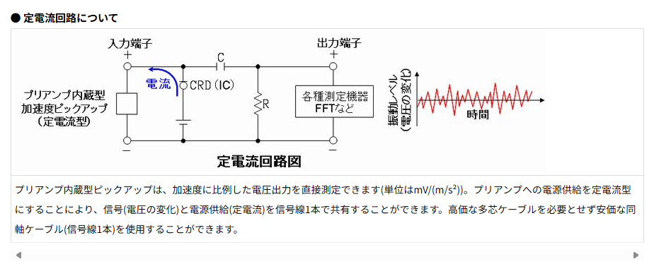 プリアンプ内蔵型ピックアップは、加速度に比例した電圧出力を直接測定できます(単位はmV/(m/s²))。プリアンプへの電源供給を定電流型にすることにより、信号(電圧の変化)と電源供給(定電流)を信号線1本で共有することができます。高価な多芯ケーブルを必要とせず安価な同軸ケーブル(信号線1本)を使用することができます。