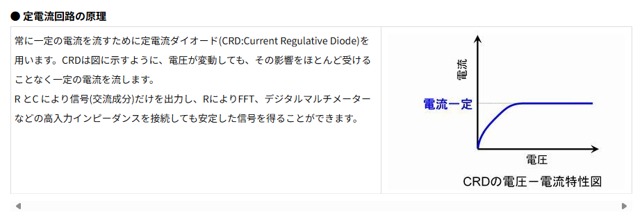 常に一定の電流を流すために定電流ダイオード(CRD:Current Regulative Diode)を用います。CRDは図に示すように、電圧が変動しても、その影響をほとんど受けることなく一定の電流を流します。