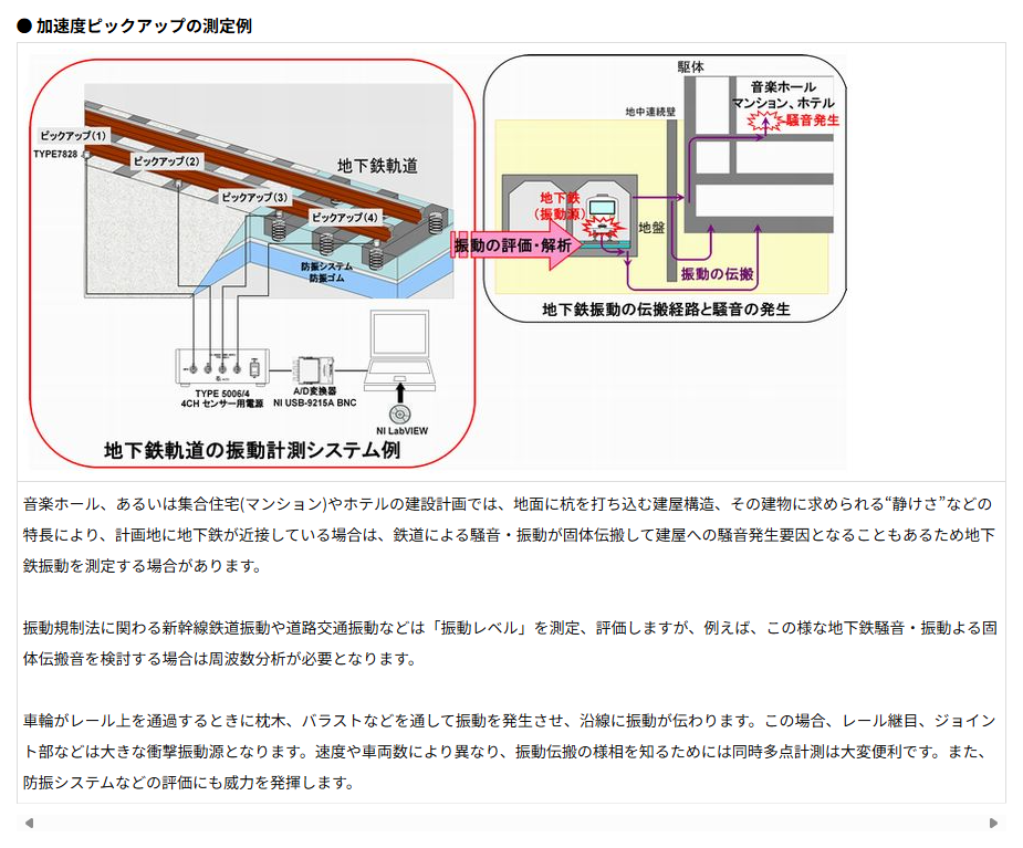 車輪がレール上を通過するときに枕木、バラストなどを通して振動を発生させ、沿線に振動が伝わります。この場合、レール継目、ジョイント部などは大きな衝撃振動源となります。速度や車両数により異なり、振動伝搬の様相を知るためには同時多点計測は大変便利です。また、防振システムなどの評価にも威力を発揮します。