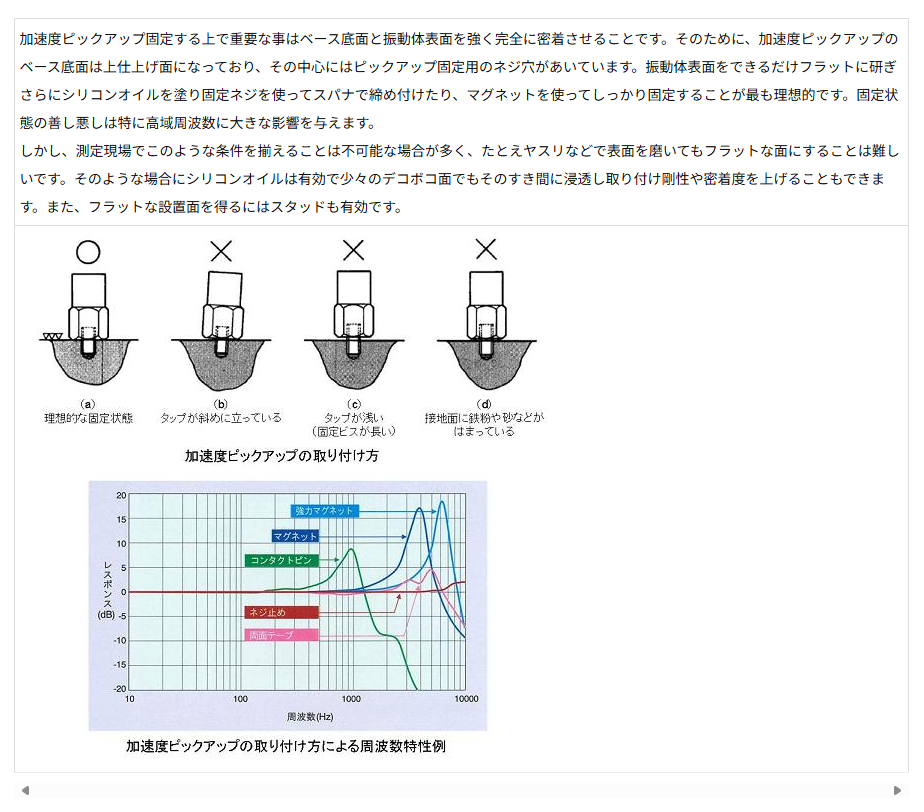 加速度ピックアップ固定する上で重要な事はベース底面と振動体表面を強く完全に密着させることです。そのために、加速度ピックアップのベース底面は上仕上げ面になっており、その中心にはピックアップ固定用のネジ穴があいています。振動体表面をできるだけフラットに研ぎさらにシリコンオイルを塗り固定ネジを使ってスパナで締め付けたり、マグネットを使ってしっかり固定することが最も理想的です。固定状態の善し悪しは特に高域周波数に大きな影響を与えます。