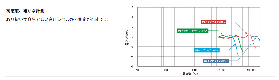 1、1/2、1/4、1/6、1/8インチの口径や周波数特性などから、用途に適した計測をサポートします。